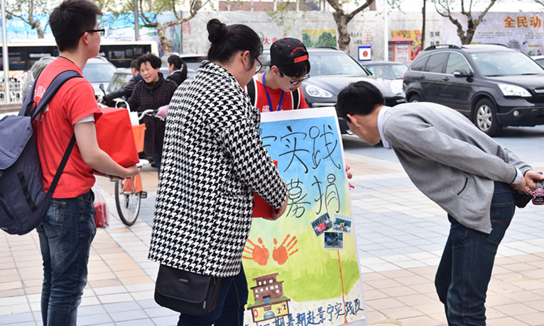 赴景宁暑期实践队分别在嘉兴市江南摩尔、华庭街商圈展开募捐活动,向社会各界募集资金、小学生所需的书本、衣物等物资。