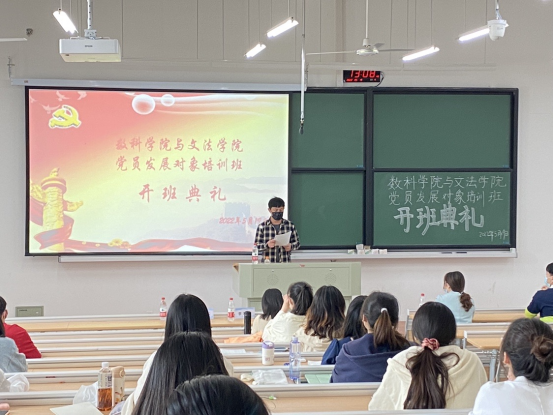 在激昂的国歌声中,开班典礼拉开了序幕。礼毕,艾芮玄老师为同学们介绍本次发展对象培训班学员及课程设置情况,对培训班课程安排、纪律问题等事宜做简单讲解。接着,数学191班的叶燕玲同学代表入党积极分子向党组织表态:作为入党积极分子将在党组织的领导下继续努力,向党员们学习,自觉加强党性修养,牢记党的宗旨,勤于钻研,开拓进取,勇于创新。最后,李寒星老师作培训班学习动员,着重强调了三个方面:一要珍惜本次培训机会,牢牢把握机遇,努力提高自己的政治素养;二要讲求方法效率,在学习中加强理论和实践的联系,争取做到学有所成;三要尊师守纪,遵循培训班的上课纪律,以一个党员的标准严格要求自己。