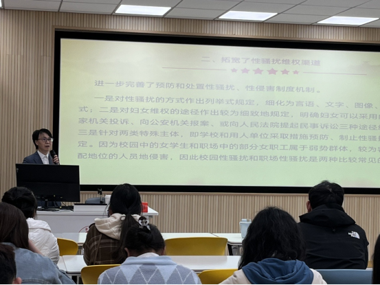 为进一步提高女性教职工、学生法律意识和依法维权能力,形成尊重和保护妇女权益的良好氛围,3月16日下午,由校妇联、校工会女工委主办,文法学院妇委会、团委承办的《中华人民共和国妇女权益保障法》专题讲座在14号楼213智慧教室举行。40余名女教职工、学生现场聆听讲座,讲座通过钉钉群同步直播。