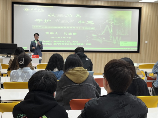 本次讲座邀请到了浙江省律师代表大会代表、嘉兴市南湖政协委员、嘉兴市律协妇联主席、浙江浙博律师事务所主任律师沈金丽担任主讲嘉宾。沈律师阐述了《妇女权益保障法》的修改背景及主要内容,有针对性地讲解了妇女在婚姻、家庭、工作和生活中经常会遇到的法律问题,从多个专业维权领域作了细致的解读,并结合现实生活中的法律案例进行了举例说明,教育大家既要知法、懂法、不违法,还要学会正确运用法律武器来维护自己的合法权益,她鼓励引导师生树立自尊、自信、自立、自强的意识,要敢于拿起法律武器保护个人权益。
