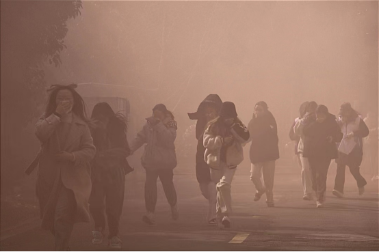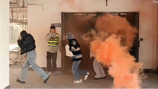 演练前,保卫处丁伟老师向同学们讲述演习要点、阐明演习步骤、严申演习纪律,并示范了灭火器的正确使用方法。同学们在老师的带领下保持整齐有序的队列,在演习始发处等待指令。演练中,警报响起,楼内浓烟弥漫,同学们用湿毛巾捂住口鼻,弯腰低身前进,按照预定的疏散路线迅速、有序地撤离到安全地带。过程中,同学们始终保持冷静严谨的态度,圆满完成了此次消防疏散演练。志愿者严守岗位,在消防演练进行做好秩序引导,消防演练得以顺利落幕。