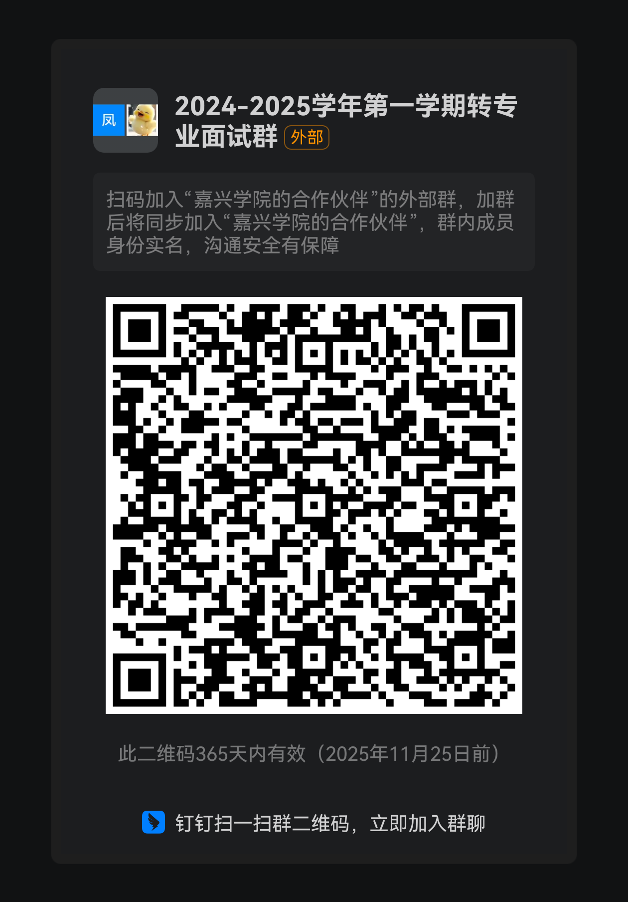 1.申请转专业的学生请钉钉扫码入群(钉钉群号:84010024408),入群后,群昵称改为现专业+姓名.