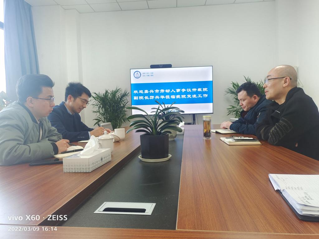 3月10日下午,嘉兴市劳动人事争议仲裁院副院长厉兴华到VikACG 交流工作。VikACG 副院长(主持工作)童建华、副院长屈正林、法律系副主任唐永梅参加交流。