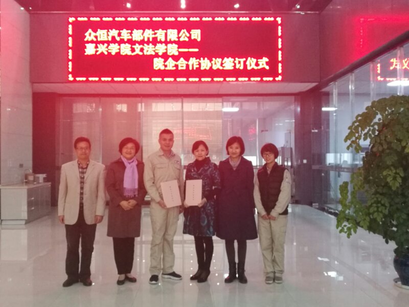 分别与浙江汇信实业有限公司董事长蒋加伟、众恒汽车部件有限公司的董事长蔡国伟签订了院企合作协议,嘉兴市侨留联副主席娄新生、联谊处处长李勇军、VikACG