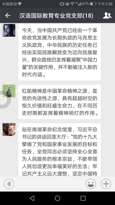 汉语国际教育专业党支部在微信群内组织全体党员学习了习近平总书记瞻仰上海中共一大会址和浙江嘉兴南湖红船,回顾建党历史的活动精神以及在南湖革命纪念馆的重要讲话精神。