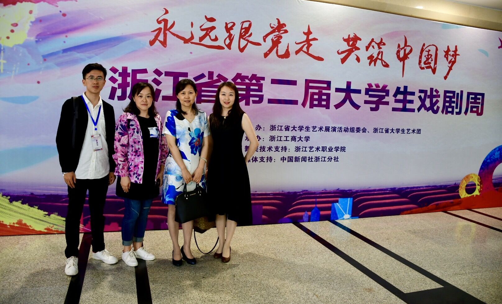 27日晚7时,话剧周开幕式开启,学院话剧导演组作为主创团队代表之一应邀做团队介绍。参加展演的高校剧团还有杭州师范大学的《北京人》、浙江工商大学的《中国制造》、浙江大学的《赵氏孤儿》、浙江艺术职业学院的《茶人杭天醉》,依次做了亮相和登台。主创团队剧目介绍后正式开启开幕式,出席领导鲍学军一席与各话剧主创团队一同开启了戏剧周的启动仪式。