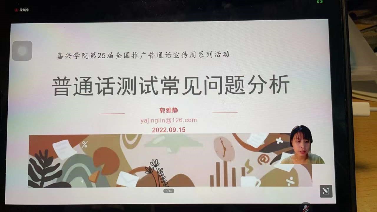 9月15日晚六点半,嘉兴学院第25届全国推广普通话宣传周系列活动之一,专题讲座《普通话测试常见问题分析》线上开讲。来自学校各个专业的学生190余人参与了讲座。