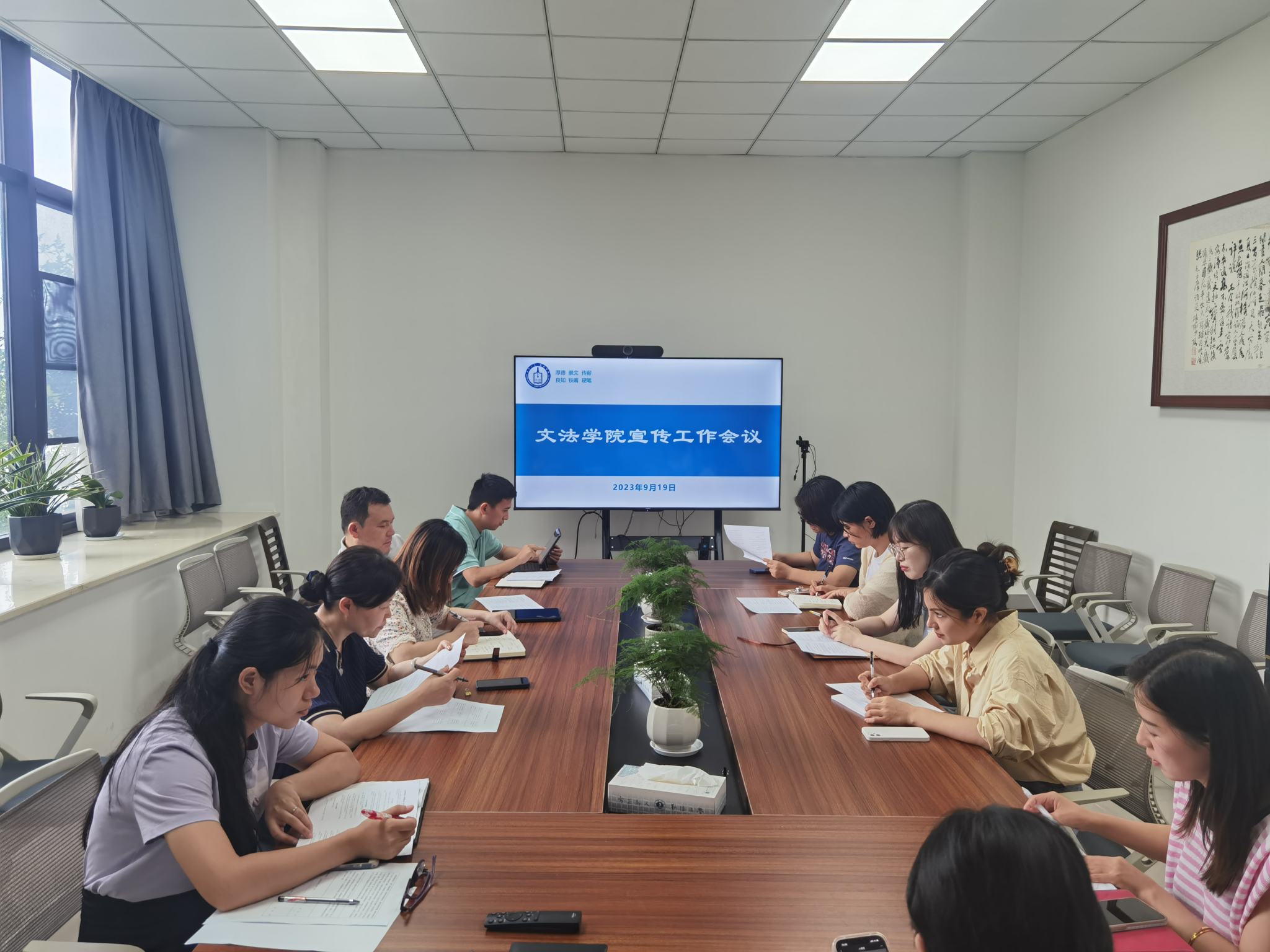 于厚德楼268会议室召开2023年下半年宣传工作会议,学院党委副书记虞岚、副院长屈正林出席本次会议,学院各部门宣传工作人员、新媒体工作室相关成员参加会议。会议由党委党委书记洪坚主持。