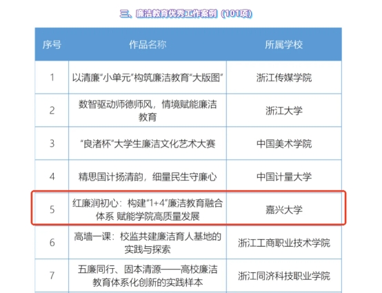 认真贯彻落实习近平总书记关于新时代廉洁文化建设的重要论述和重要讲话精神,坚持将红船启航地红色基因与嘉兴地域清廉文脉深度融入立德树人全链条,聚力打造“红廉润初心”工作品牌,通过强化“一个贯通”,融合“四维矩阵”,构建“1+4”廉洁教育融合体系,推进廉洁文化可观、可听、可感、可触,将清廉文脉化无形为有形,以高质量廉洁文化建设推进学院高质量发展。