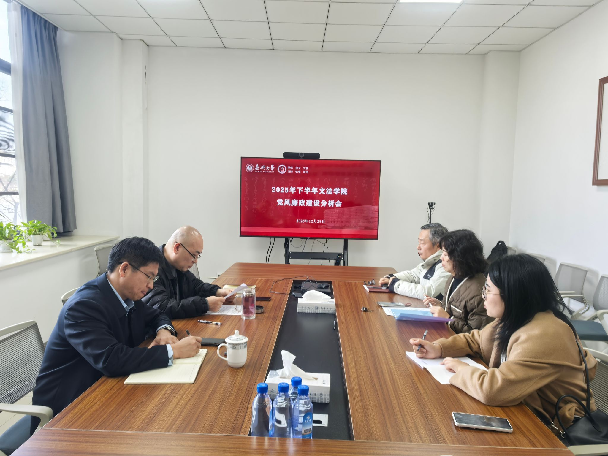 党委在厚德楼268会议室召开2025年下半年党风廉政建设情况分析会。会议由学院党委书记童建华主持,学院党政领导班子成员参加会议,特约监察员刘焕芳列席会议。