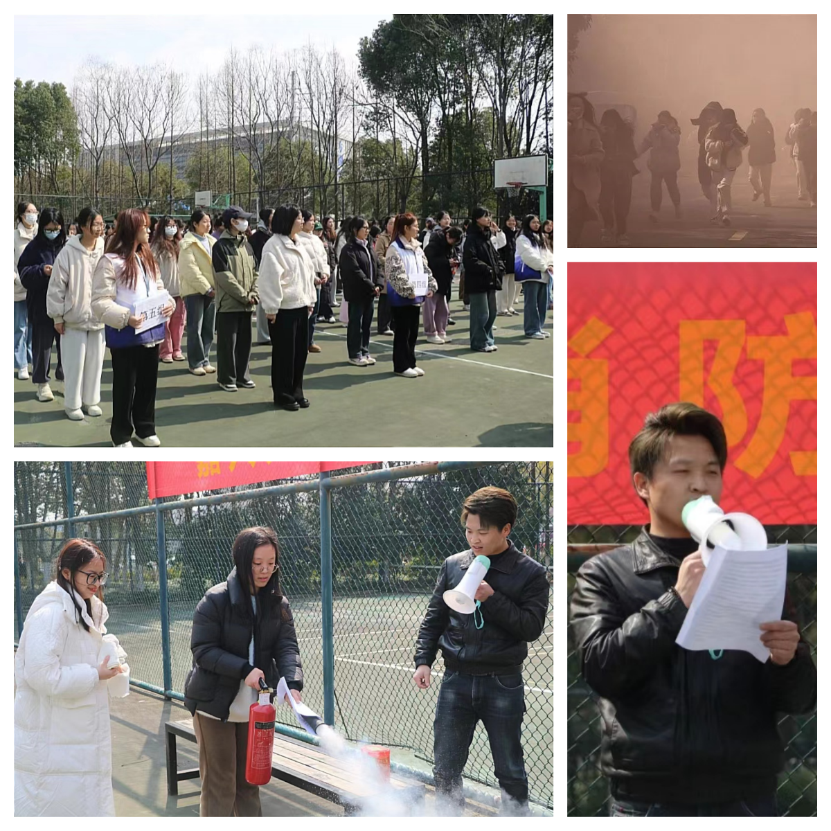 演练开始前,专业消防员们事先在篮球场上向同学们讲述演习要点、阐明演习步骤、严申演习纪律,并示范了灭火器的正确使用方法。同学们在老师的带领下保持整齐有序的队列,在演习始发处等待指令。