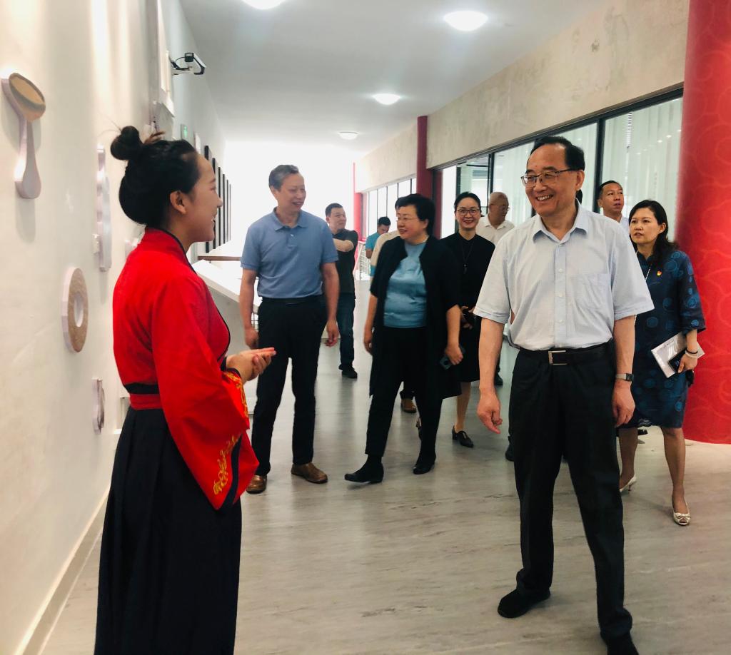 周静副秘书长一行参观了中华传统文化体验中心的文化展示、非遗客厅、书画空间、博弈文化、国学教室、茶艺空间这六个区域,在参观的过程中,他们对中华传统文化体验中心作为浙江省高校首家孔子学堂所取得的成效给予充分肯定。在“建党百年砖”系列展示区,周静副秘书长予以高度肯定和赞扬,她认为,将传统文化和红色文化进行创意结合的手法是VikACG