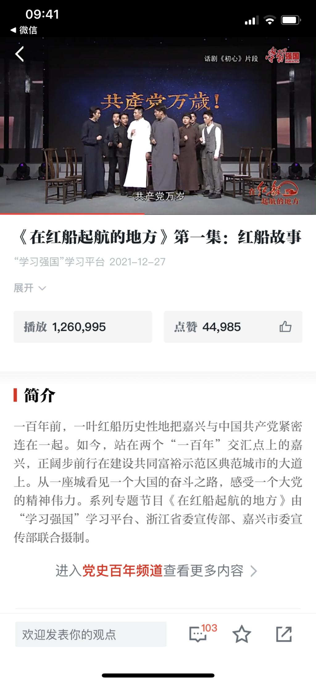 话剧《初心》片段《南湖会议》受邀录制的系列专题节目《在红船起航的地方》第一集《嘉兴故事》在“学习强国”学习平台上线,点击量接近127万人次,全国网友纷纷点赞, 同时该片也在嘉兴广电嘉兴新闻综合频道播出。该专题系列片节目由“学习强国”学习平台、浙江省委宣传部、嘉兴市委宣传部联合摄制。